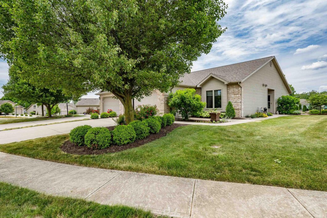 Gorgeous move-in ready villa with a fantastic sunroom in highly desirable Eagle Glen—the only 18 hole golf course in Columbia City! Located in a quiet & peaceful area on the far east end of the course & on a cul de sac, you’ll love driving home through this beautiful manicured neighborhood. Built in 2006, this 2 bedroom, 2 full bath home has been well maintained from outside in with a brand new roof & finished 2 car garage. Classic exterior is attractive mix of vinyl & brick façade with detailed landscaping (hello rose bushes!) providing additional privacy to the already private, covered side entrance just around from the side garage exit. Inside you’ll find a bright & welcoming atmosphere complemented by white trim & a soft neutral color palette—the perfect backdrop to your own personal style! Open concept layout features an expansive great room with soaring chamfered ceiling, tons of natural light & views of back yard greenery. Off the living room is an excellent four seasons room offering wrap-around panoramic views of outdoors—the ideal spot for reading, having a quiet moment, or simply watching the seasons change. Inviting eat-in kitchen next to living room includes cozy casual dining nook underneath chandelier & wrap around breakfast bar great for quick bites. Aesthetically pleasing kitchen has everything you need with wood flooring, abundant white cabinetry, tile backsplash, recessed lighting & SS appliances (all included); washer & dryer are tucked out of the way behind a pocket door next to the garage access. Spacious primary bedroom with accent wall has en suite bath with granite countertop vanity, walk-in shower & large walk-in closet (also with pocket door). 2nd bedroom is comfortably sized with recessed window & ample storage throughout; main shared bath also has matching granite vanity, framed mirror & tub/shower combo. Head out back to your own corner patio whenever you want to kick back & relax in the sunshine & enjoy the breeze, or chill with a cold drink in hand. Monthly dues are $50 which includes mowing, fertilizing & snow removal of 2” or more so you don’t have to worry about yard work cutting into your schedule. Mere minutes from US-30 & IN-205 for easy access to shopping, dining & groceries as well as local favorites in the picturesque downtown such as Pickles Café & Blue Moon Bakery. Close to Morsches Park & Parkview Whitely Hospital with both Fort Wayne & Warsaw only half an hour away. This one won’t last long—take action today!