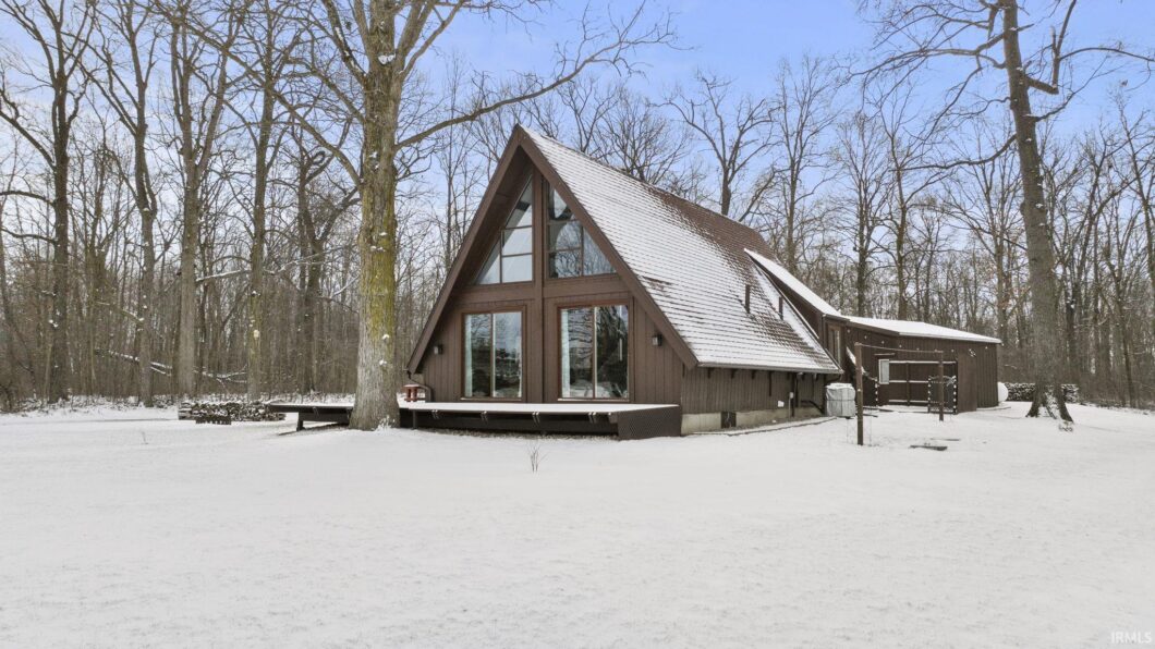 Quaint A-Frame home on a beautiful wooded setting! If you are looking for your own little oasis, this 2-bedroom home is situated on just under an acre is surrounded by mature trees and scenic views. Home has had almost all of the expensive items done for you in the last 4 years. New roof (2020), new furnace & a/c (2020), new flooring, fresh paint, new landscape rock, new sump pump, new windows, new kitchen cabinets (2022), and new wood burning stove & pipe. Some features of the home include wrap around porch, detached 24×28 garage, main level bedroom and main level laundry, cozy living room with tall ceilings and large picture windows, and full basement providing tons of storage space. This home is a hidden gem and has so much to offer for an affordable price! Be sure to check it out.